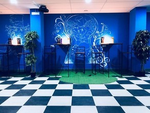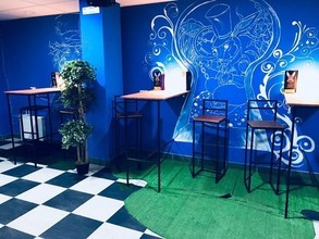 Дух приключений Алисы виден в каждой детали. Это и шахматное поле, и белоснежный сервис, и поле с неоновыми грибами… Гости могут разместиться на уютных диванах за столиками кафе-бара «Белый Кролик». А для парочек и компаний в кафе-баре обустроены лаунж-зоны.